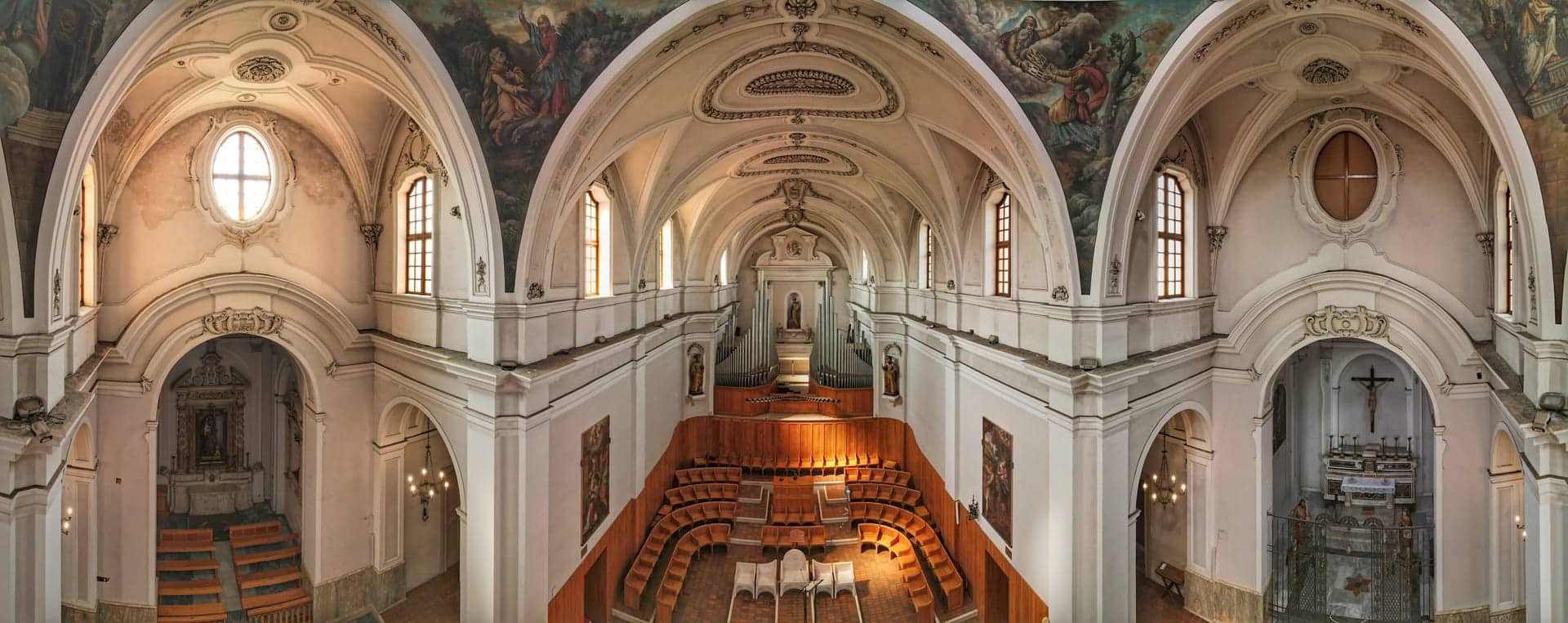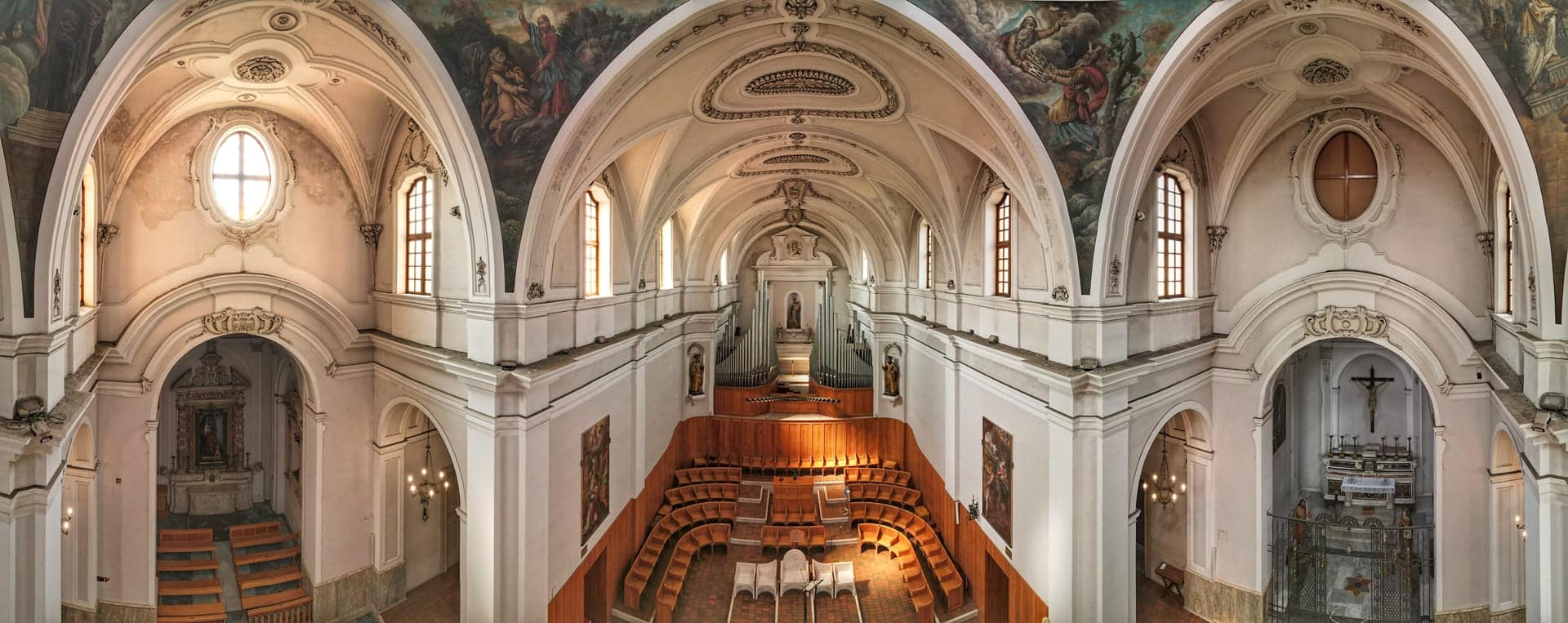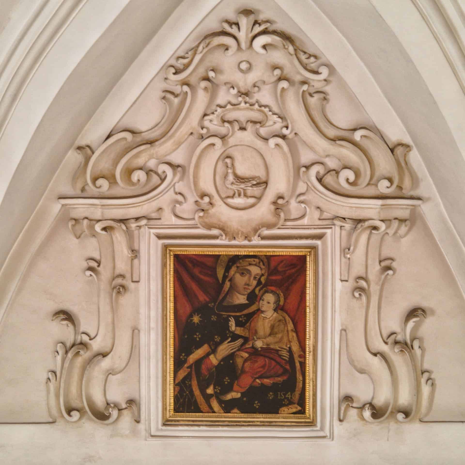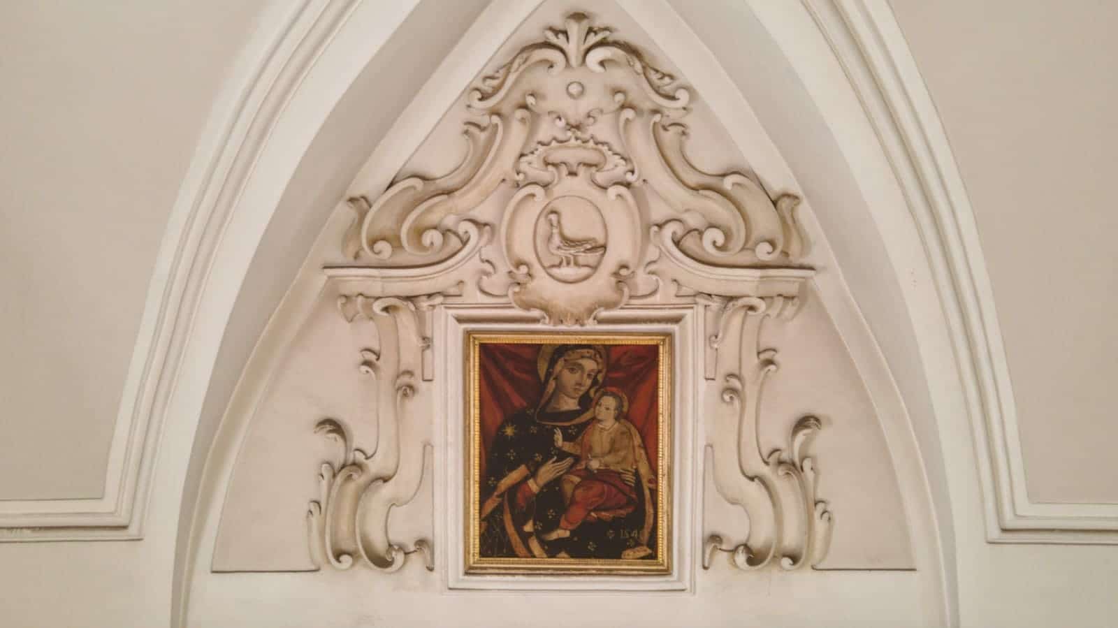 Oltrepassato il suo ampio ingresso, ti troverai in un ambiente, con pianta a croce latina, a tre navate. Quelle laterali sono divise in campate voltate a crociera, frutto dell’abbattimento delle cappelle gentilizie, avvenuto nel Settecento. In quella circostanza furono eretti il cappellone della Madonna di Pozzo Faceto (l’attuale sacrestia), gli ampi scaloni e il nuovo coro con l’altare maggiore. Lascia il tuo sguardo farsi catturare dal transetto che si conclude col cappellone di San Giuseppe, a sinistra, e quello del Crocifisso, a destra, mentre al suo incrocio coglierai tutta la magnificenza della grande cupola ellittica. Nei pennacchi sono dipinte quattro scene, opera del pittore locale Ferdinando Schiavone (1862-1937), con scene del Vecchio e Nuovo Testamento e legate alla Storia della Chiesa