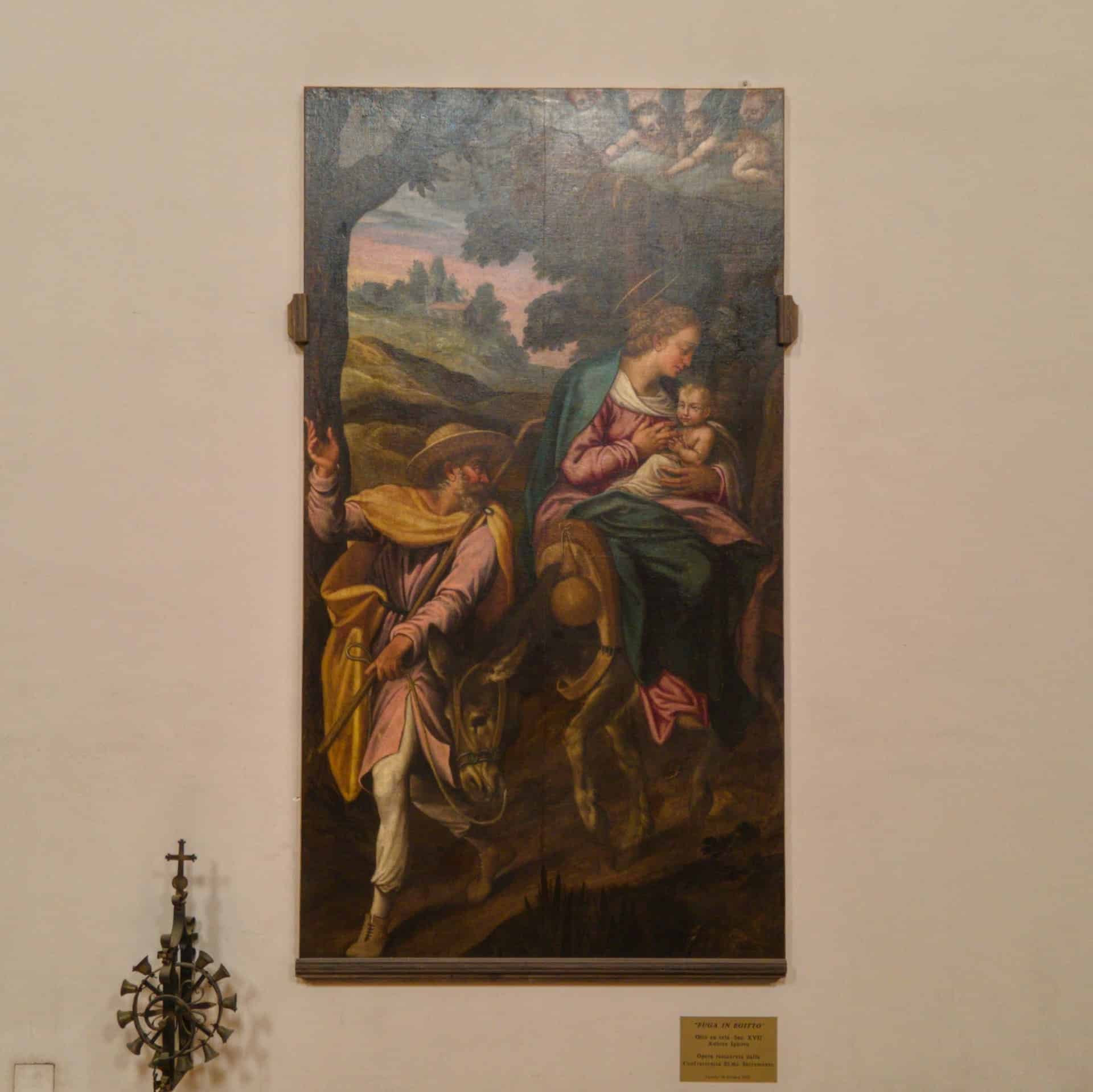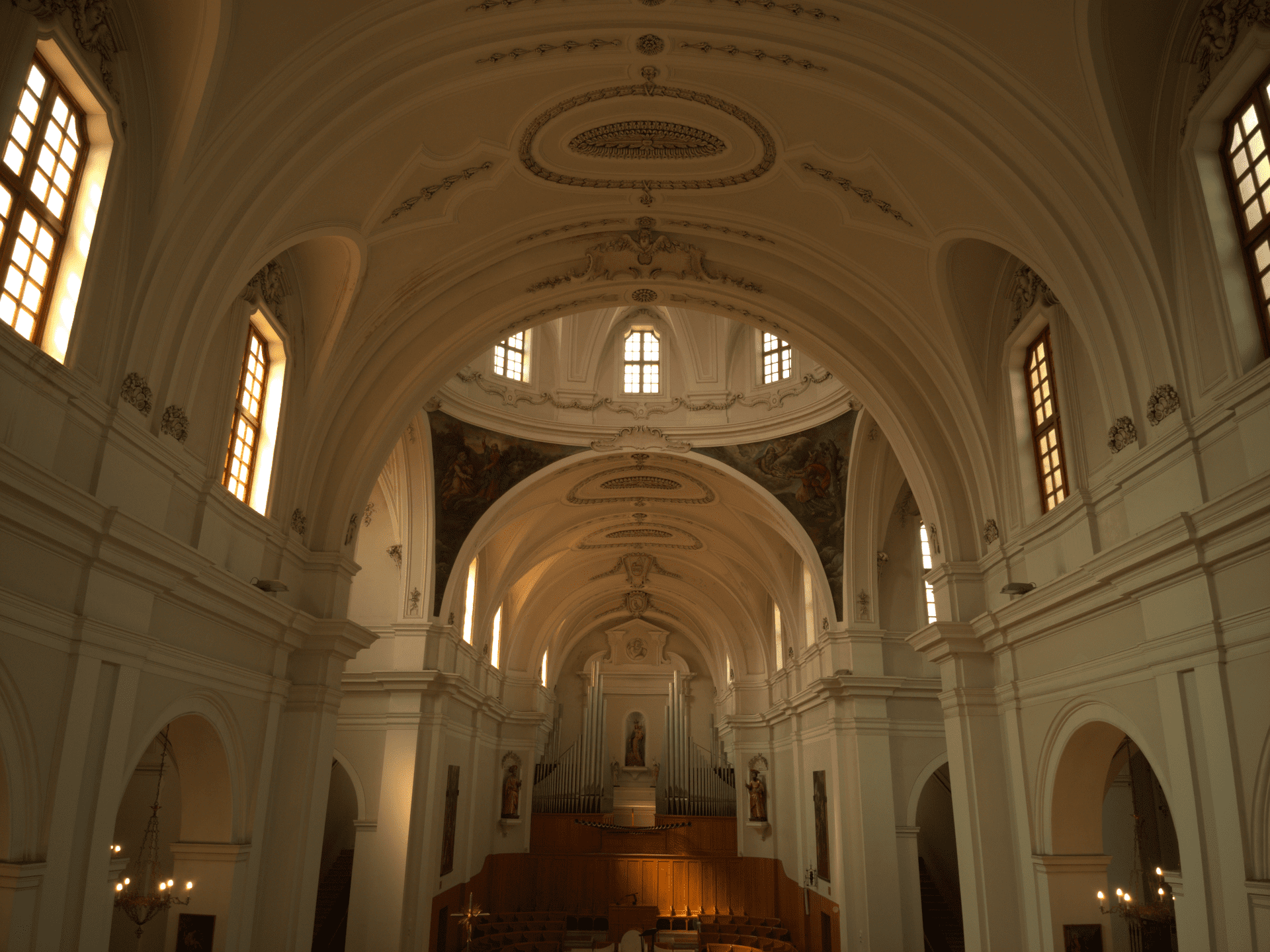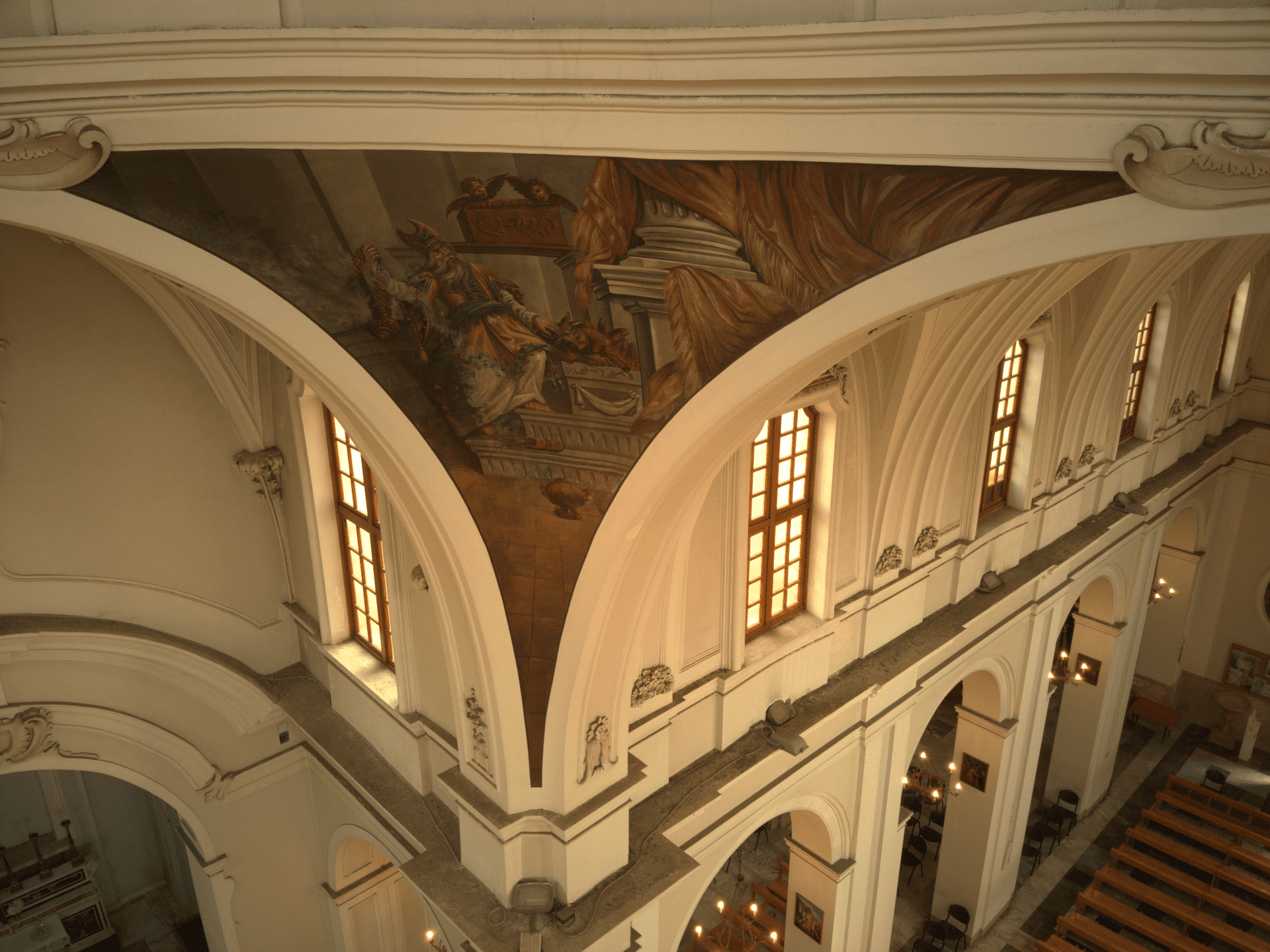 Oltrepassato il suo ampio ingresso, ti troverai in un ambiente, con pianta a croce latina, a tre navate. Quelle laterali sono divise in campate voltate a crociera, frutto dell’abbattimento delle cappelle gentilizie, avvenuto nel Settecento. In quella circostanza furono eretti il cappellone della Madonna di Pozzo Faceto (l’attuale sacrestia), gli ampi scaloni e il nuovo coro con l’altare maggiore. Lascia il tuo sguardo farsi catturare dal transetto che si conclude col cappellone di San Giuseppe, a sinistra, e quello del Crocifisso, a destra, mentre al suo incrocio coglierai tutta la magnificenza della grande cupola ellittica. Nei pennacchi sono dipinte quattro scene, opera del pittore locale Ferdinando Schiavone (1862-1937), con scene del Vecchio e Nuovo Testamento e legate alla Storia della Chiesa