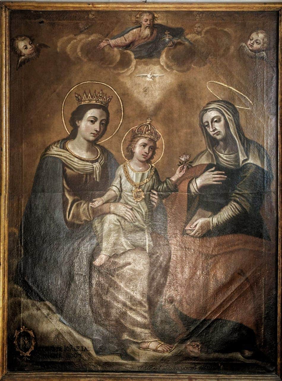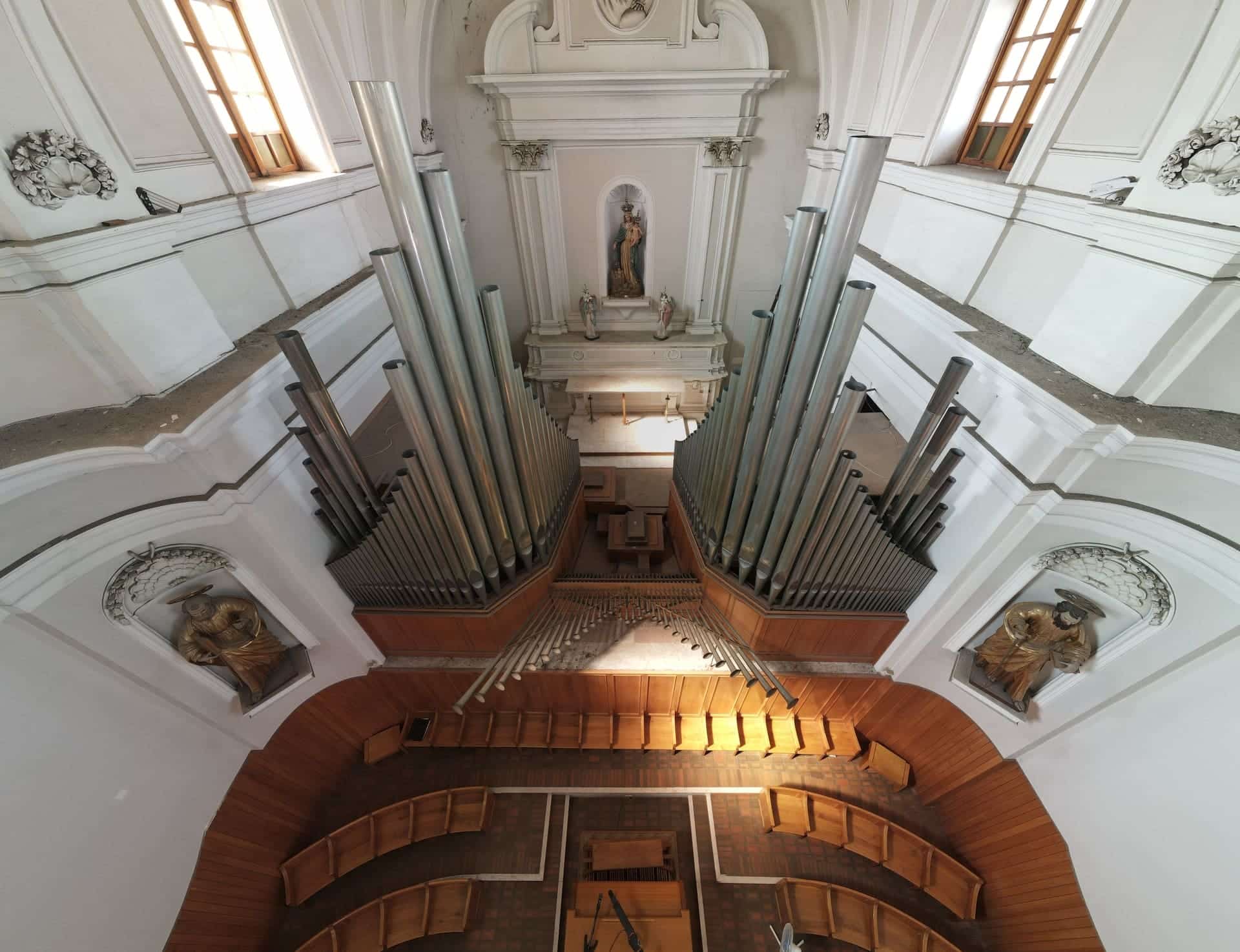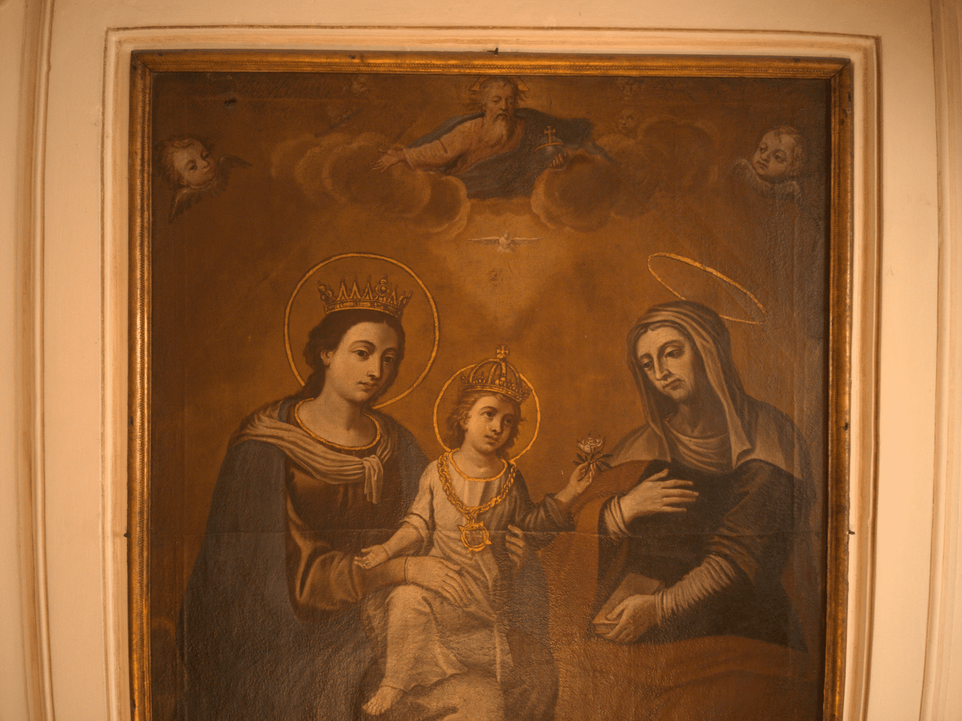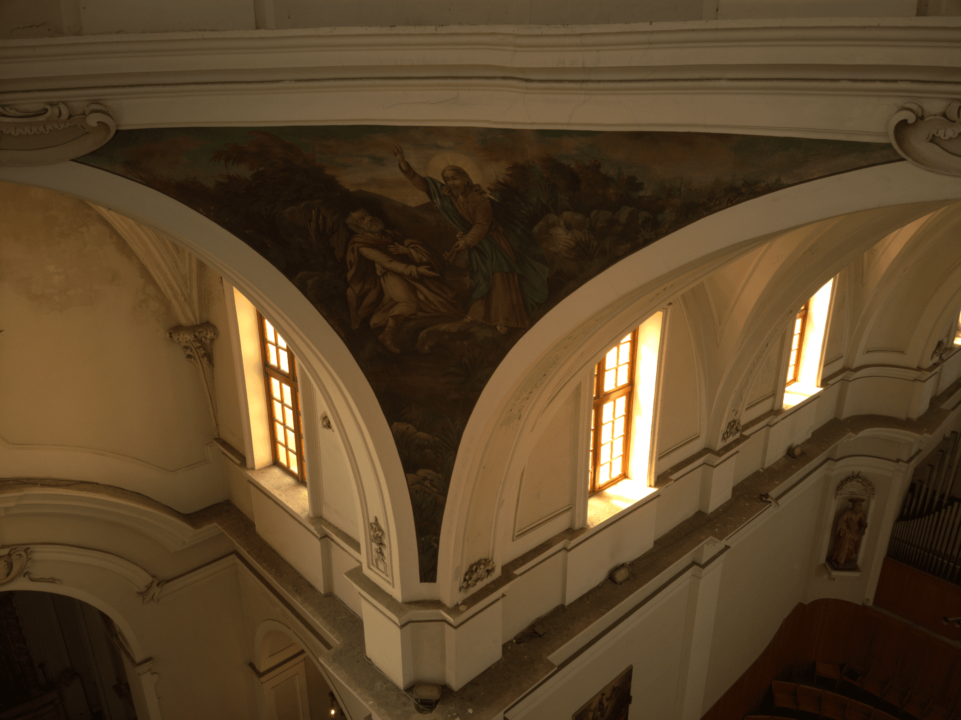 Oltrepassato il suo ampio ingresso, ti troverai in un ambiente, con pianta a croce latina, a tre navate. Quelle laterali sono divise in campate voltate a crociera, frutto dell’abbattimento delle cappelle gentilizie, avvenuto nel Settecento. In quella circostanza furono eretti il cappellone della Madonna di Pozzo Faceto (l’attuale sacrestia), gli ampi scaloni e il nuovo coro con l’altare maggiore. Lascia il tuo sguardo farsi catturare dal transetto che si conclude col cappellone di San Giuseppe, a sinistra, e quello del Crocifisso, a destra, mentre al suo incrocio coglierai tutta la magnificenza della grande cupola ellittica. Nei pennacchi sono dipinte quattro scene, opera del pittore locale Ferdinando Schiavone (1862-1937), con scene del Vecchio e Nuovo Testamento e legate alla Storia della Chiesa