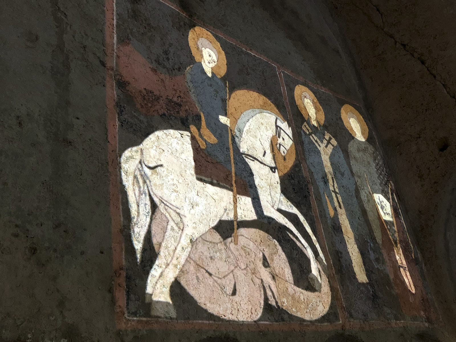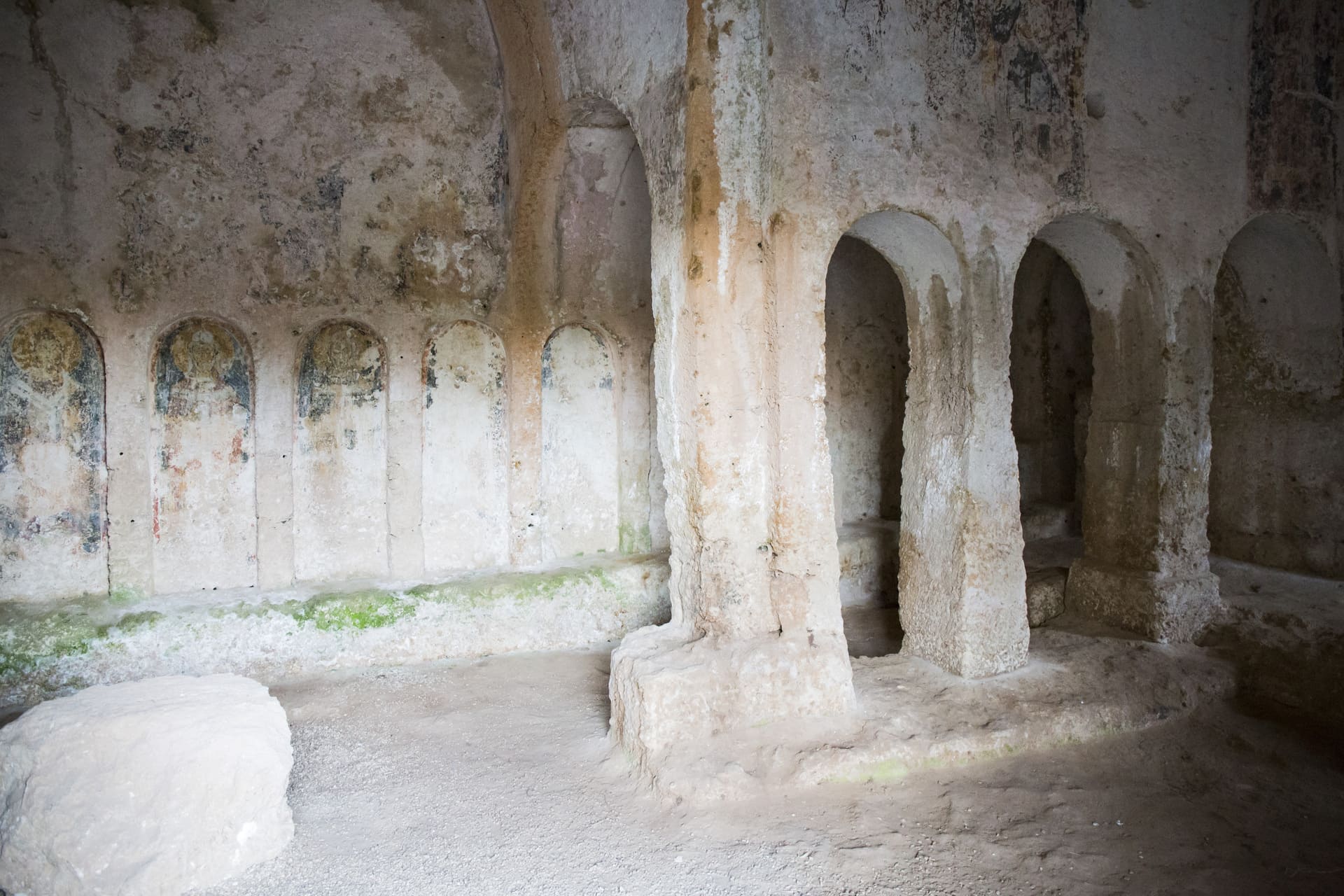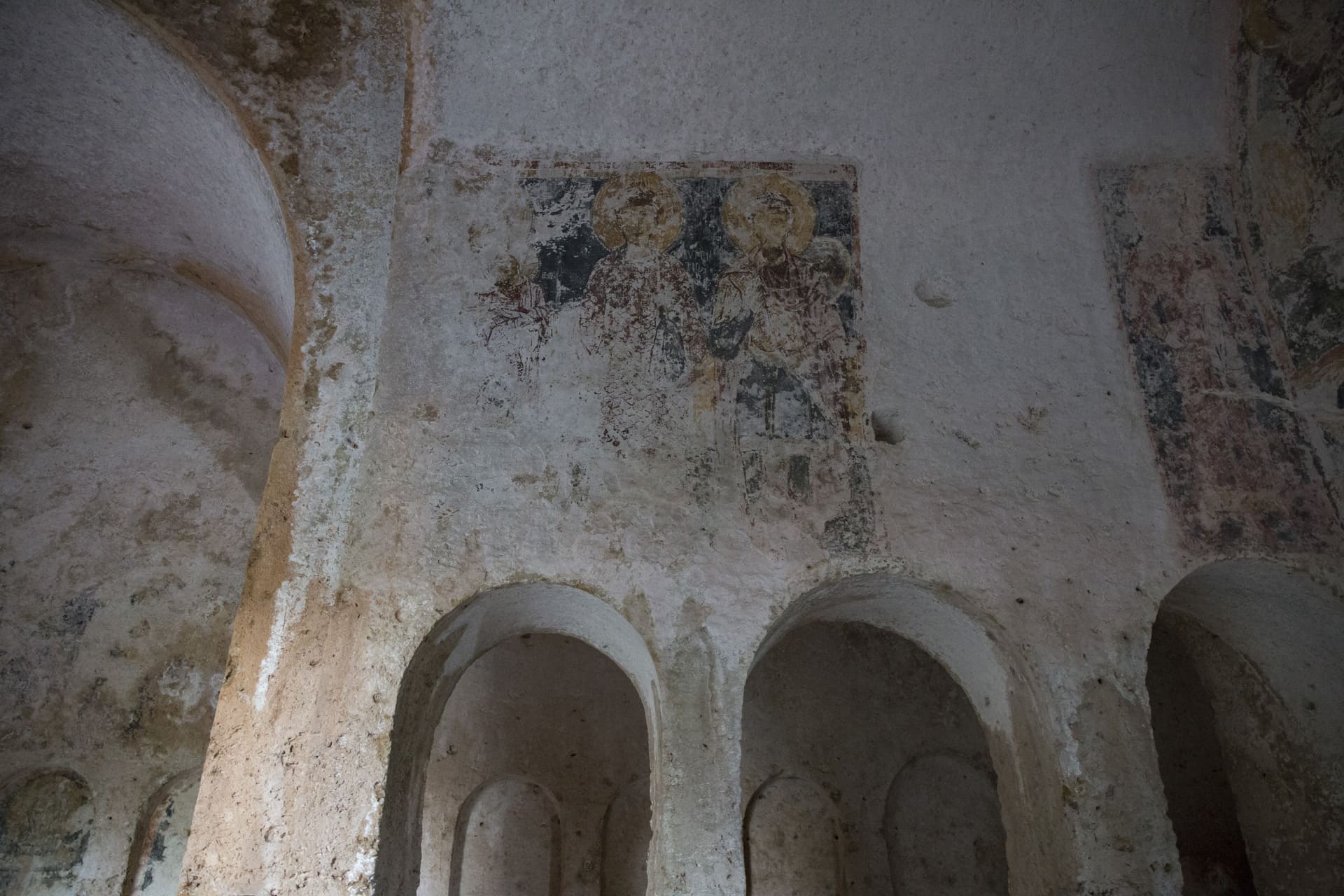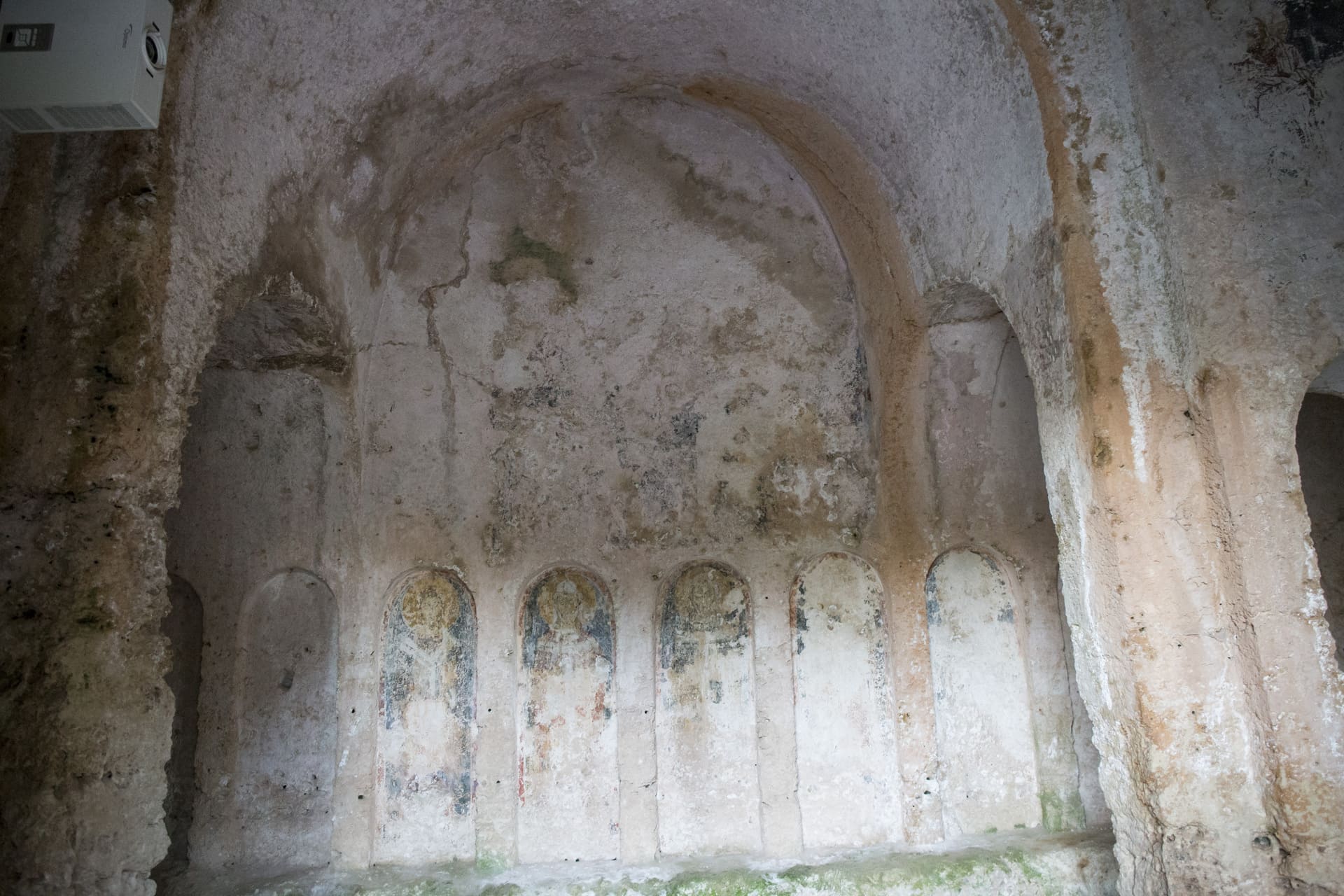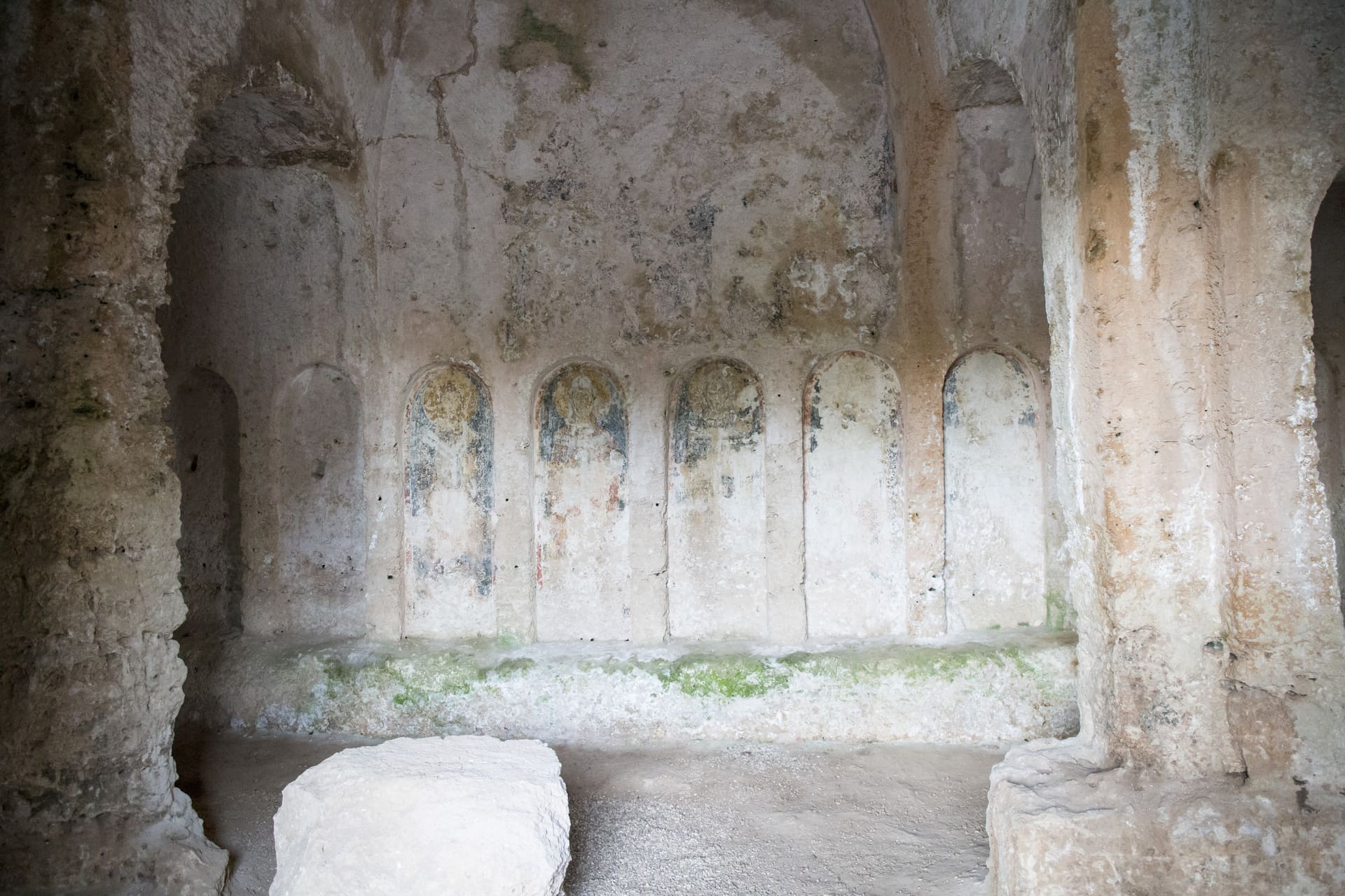 Nell’abside si ammirano tracce di pittura più chiare, con una Deesis dell’XI-XII secolo, composta dal Cristo in trono, inserito in una mandorla fra l’Odegitria (Madonna Nikopoia) e il Precursore (San Giovanni Battista). In basso compaiono tracce dei simboli apocalittici degli Evangelisti (il leone per San Marco, il bue nimbato per San Luca). Gli affreschi adornano tutti gli altri spazi parietali, compresi gli archetti ciechi, in cui risaltano diverse figure di santi-vescovi, insieme a molteplici immagini anonime, frutto di decori e scritte relativi ad epoche e stili pittorici diversi.