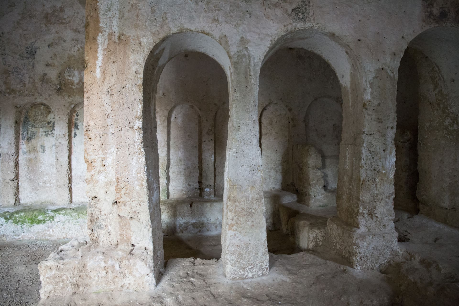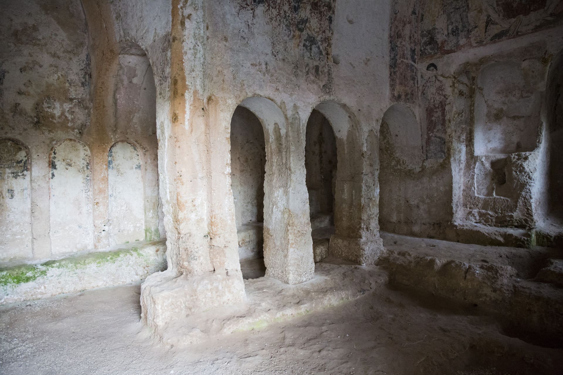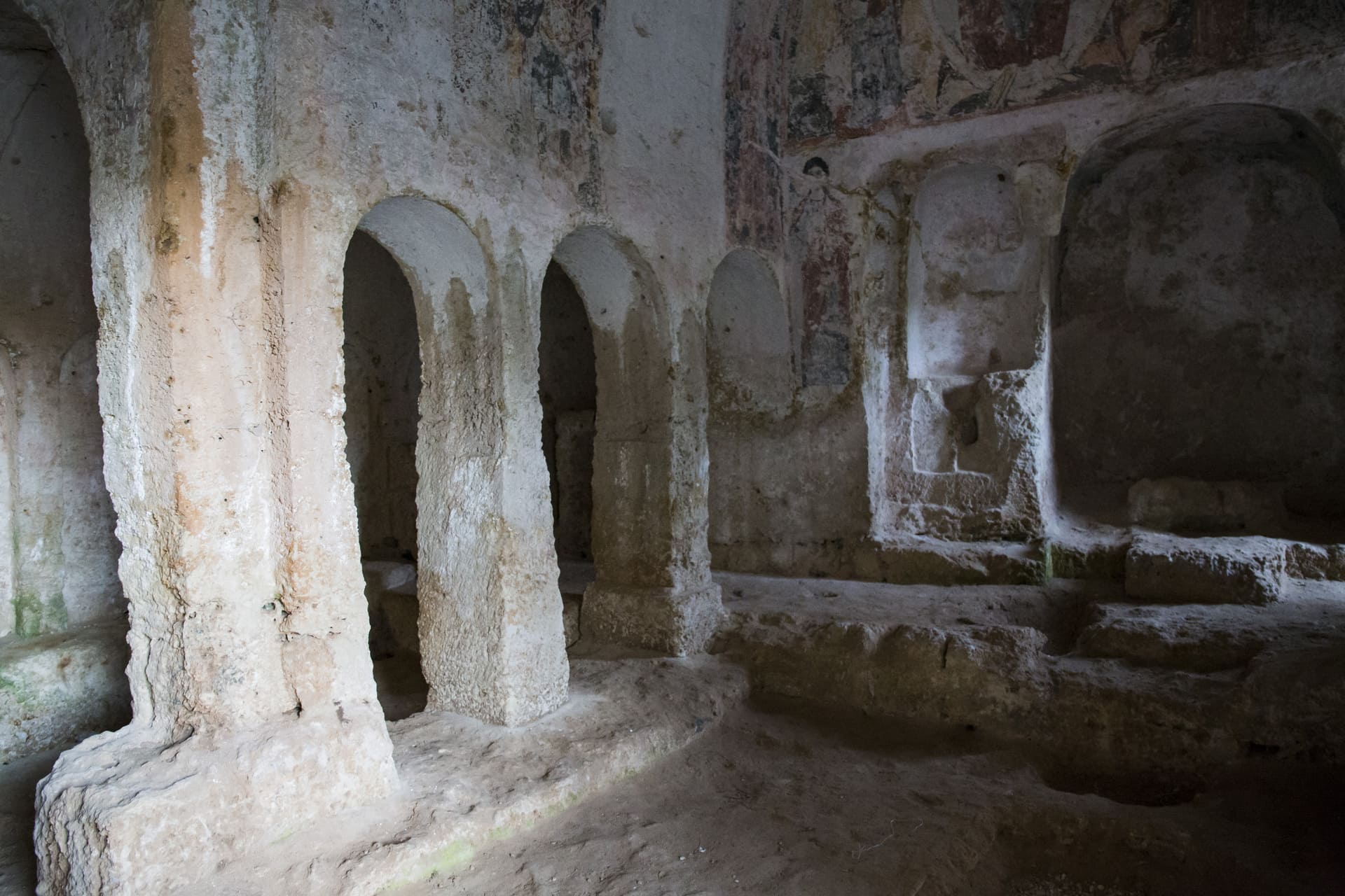 La cripta è completamente affrescata, mentre lungo le pareti che vanno dall’ingresso fino alla navata più piccola sono state scavate 23 arcate cieche affrescate con figure di santi vescovi anche se compromesse da agenti atmosferici.