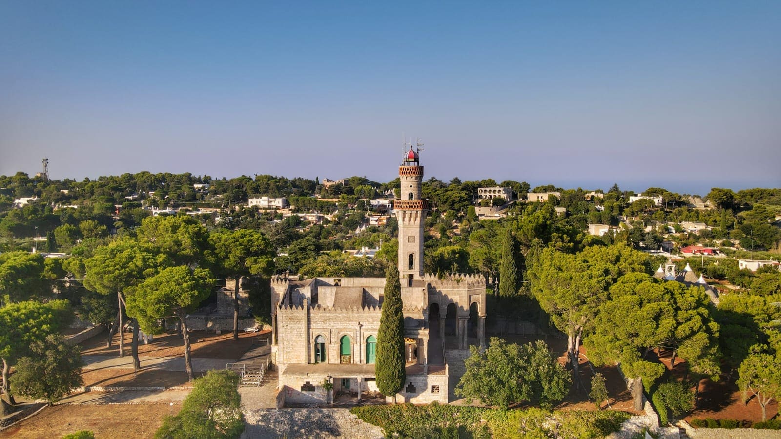 E grazie a queste esperienze conoscerai più da vicino la singolarità di certi trulli e una chiesa, detta “trullo del Signore”, di storiche masserie e di raffinate ville in stile liberty. Ma attento ad aguzzare la vista. Ad un certo punto scorgerai, tra stradine e viali di pini, le fiabesche linee architetture di un minareto. Si, proprio un vero minareto. Quello che è una sorta di faro che viene illuminato, dall’alto al tramonto, per la sua esclusiva posizione in altura. Un sito da cui contemplare una natura che degrada dolcemente dalle colline, passando per la piana degli ulivi millenari e sfociando nel Mediterraneo.
